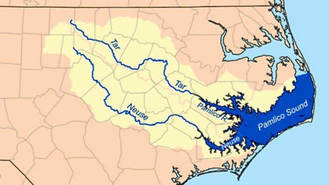∞ The Tar River is approximately 215 miles long, flowing southeast to the estuary of Pamlico Sound. The Tar-Pamlico watershed is the fourth largest in North Carolina. The Tar River becomes the tidal Pamlico once it passes under the US 17 Bridge in Washington, NC, often called “Little Washington.”