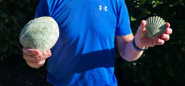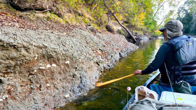 The PENC book told us to expect at mile 11.2 a riverbank with large, fossilized scallop shells. Right on cue we found the riverbank with shells.