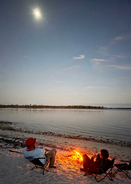 As Alec prepared a meal of shrimp and pasta, the temperature dropped, and the wind strengthened, gusting to 30-40 mph. As we huddled around the fire, John shouted, “Dad, your tent is blowing down the beach.” My gear was stored inside the tent for ballast but the winds were strong. I have done quite a bit of camping in my day, but this has never happened to me. We raced down the beach and grabbed my tent and secured it more tightly. Once this was done, I decided to call it a night, partly because I was worried my tent might blow off again.