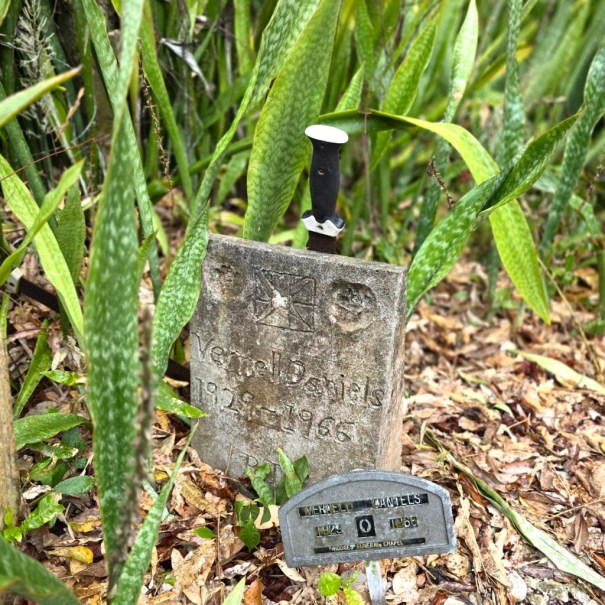 Snake plants surround a tombstone in a small cemetery. These plants re invasive and nearly indestructible. Any part of the plant can regenerate new growth. [Trivia: The famous painting by Grant Wood, American Gothic, has a snake plant on the porch behind the farm couple.]