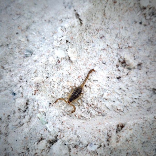 Back at our campsite, we were getting settled around the campfire when Alex shouted, “Look out!” A scorpion was very close to my feet. Florida has a variety of venomous scorpions but their stings are rarely fatal to humans, resulting instead in the pain, swelling, and irritation comparable to a wasp sting. Alec enticed the scorpion to a stick and released it down the beach.