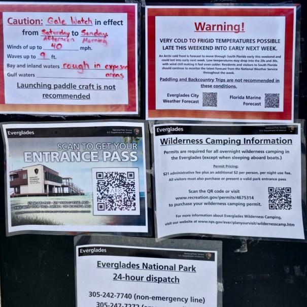 On most paddle trips, I keep a close eye on the weather for weeks in advance. An unusual Arctic cold front was expected to hit southern Florida on the days of our trip. The forecast was for good weather on Friday, then Saturday the temperature dropping midday and the wind picking up. Sunday would be cold (high 30’s) but sunny. I grew up in Wisconsin and our family spent four cold years in Beijing so the weather forecast didn’t bother me much. The National Park Service issued a warning of “Adverse Weather and hazardous boating conditions” which is not exactly what a paddler likes to see starting off a trip.
