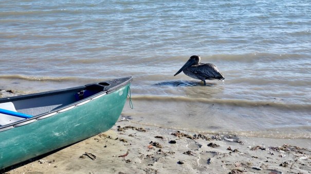 By morning the wind had quieted down, and the sun was out, making the weather tolerable. The tide was coming in so it was time to get on the water. We had oatmeal for breakfast and quickly broke camp. A visitor came by looking for food scraps as we departed.