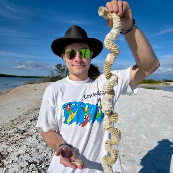 John found a whelk egg case on the beach. Whelks are similar to conchs. Conchs are typically tropical, herbivorous snails with thicker shells while whelks are temperate-water, carnivorous predators with thinner shells. Whelk egg cases, sometimes called “mermaid’s necklaces” are long, papery, spiral-shaped strings of disc-shaped capsules, often found washed up on beaches. Each capsule holds dozens of developing eggs, which hatch as miniature, fully formed whelks.