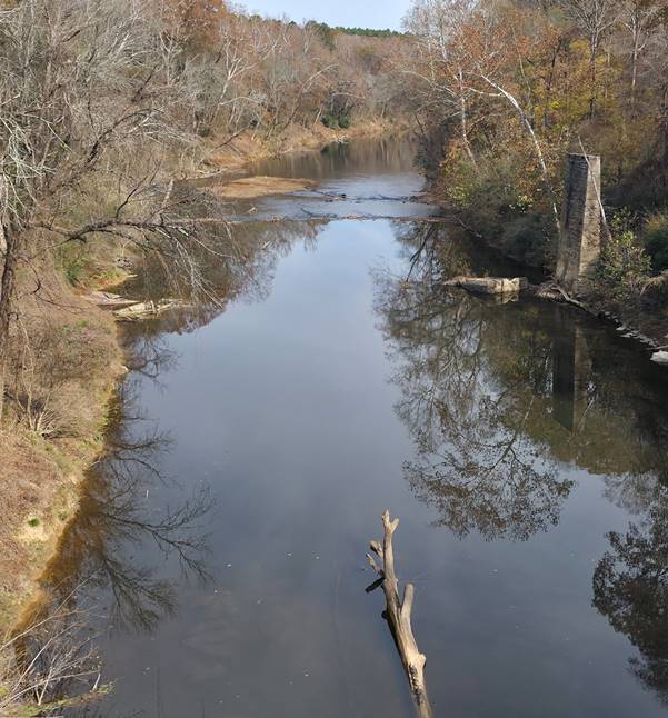 Downstream view of the river from the bridge. It is hard to see but there are 4 turtles sunning themselves on the log and on the right there is the foundation of an old bridge.