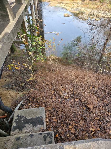 I paddled section 6 (10.5 miles – page 75 in Paddling Eastern North Carolina by Paul Ferguson) five years ago in the middle of the summer with my younger son Matthew. There were significant challenges with both the put-in and take-out, probably the toughest of any trip I have done in NC. Five years ago we chose to use ropes (see below) at the NC 22 bridge which is not a put-in approach mentioned in PENC. The brush was too thick at the time to use either of the suggested put-in approaches mentioned in PENC. At the take-out there is a 70-foot-high bank of riprap that you must climb to get to the road (see below).